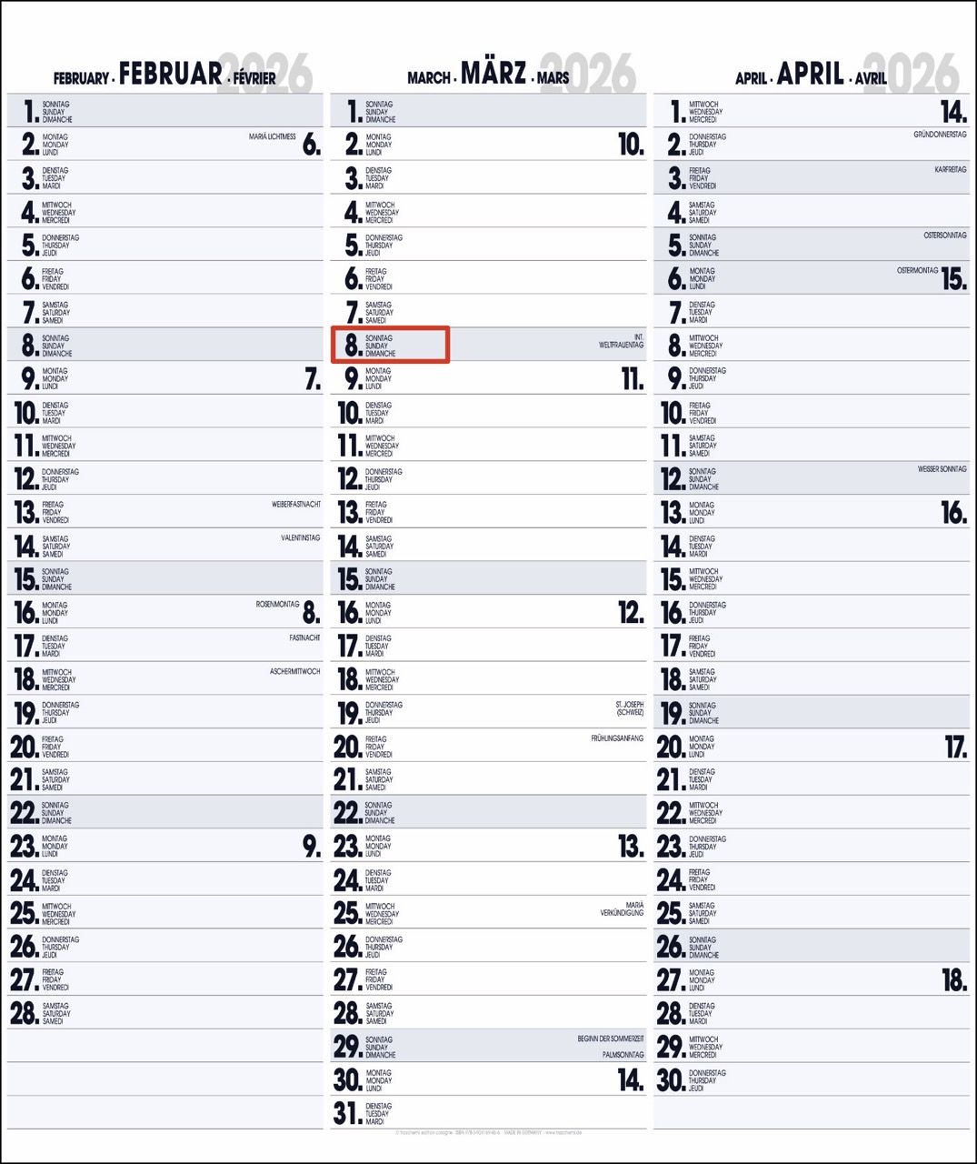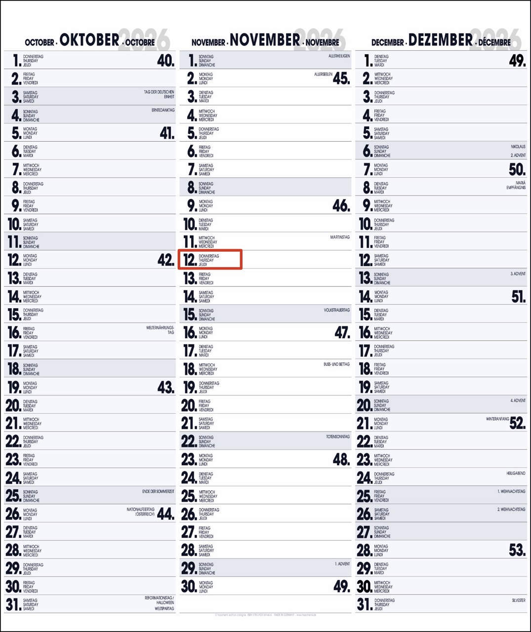 12 Kalenderblätter, internationales Kalendarium, Wire-O-Bindung, Datumsschieber,