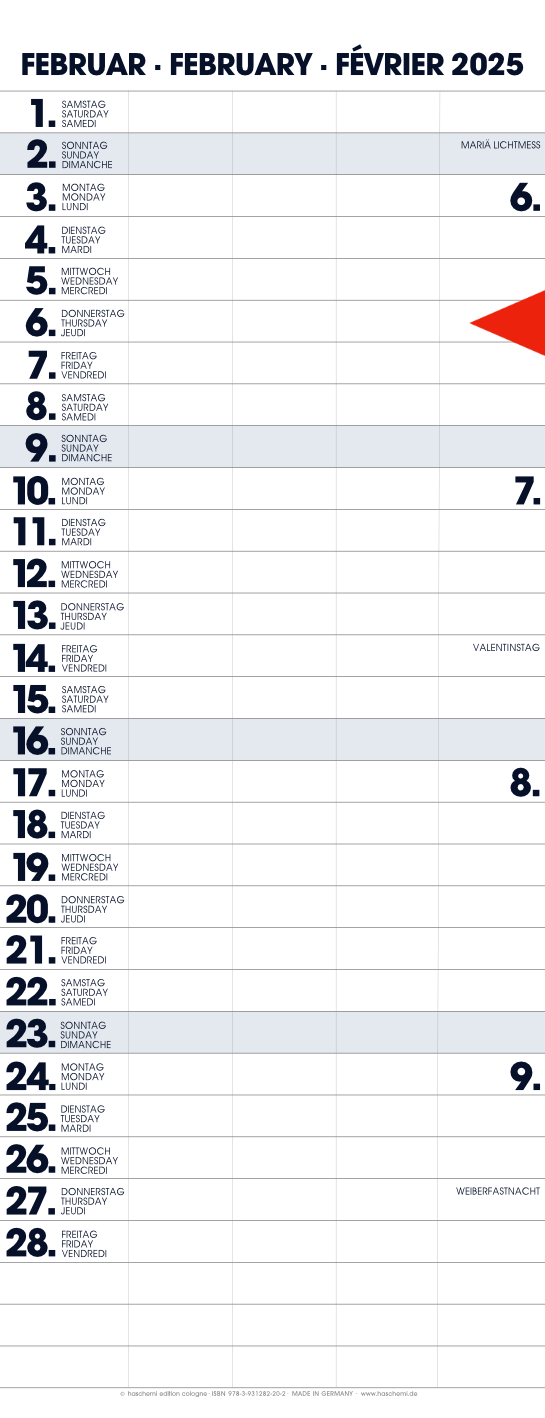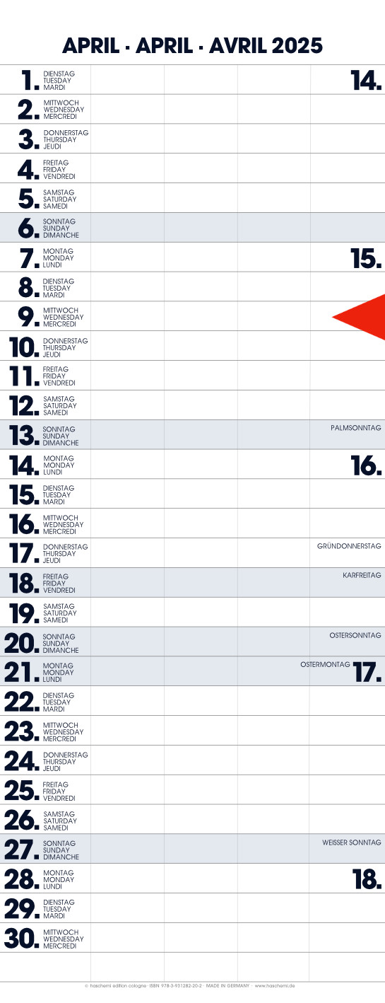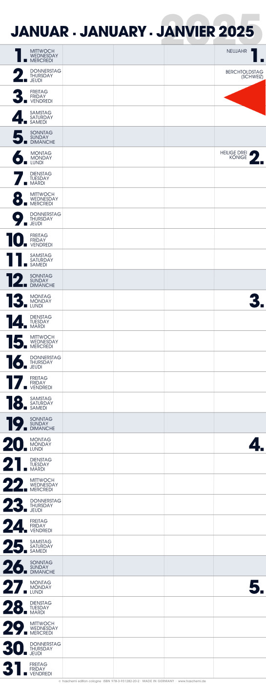 12 Kalenderblätter, internationales Kalendarium, Wire-O-Bindung, Datumsclip, Format 20 x 50 cm