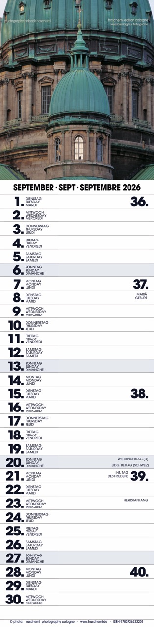 13 Farbreproduktionen, internationales Kalendarium, Wire-O-Bindung, Format 10 x 42 cm